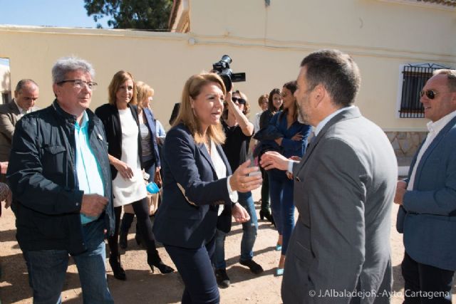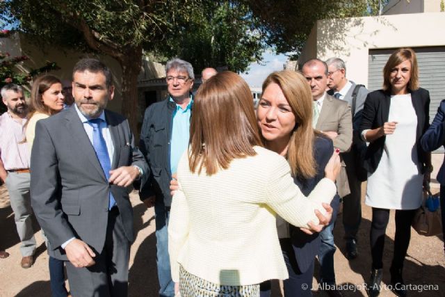 El alcalde de Cartagena, José López, junto a la vicealcaldesa, Ana Belén Castejón, el concejal del área de Calidad de Vida, Francisco Calderón, y la edil de Servicios Sociales, Carmen Martín, han acompañado a la Secretaria de Estado de Servicios Sociales, Susana Camarero, en su visita a La Huertecica. La consejera de Familia e Igualdad, Violante Tomás, también ha asistido a la visita.