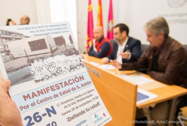 El alcalde, José López, ha comparecido hoy martes ante los medios de comunicación acompañando al portavoz de la Plataforma por la Sanidad Pública, Leandro Sánchez, y al presidente de la Asociación de Vecinos Nueva Cartagena, Antonio Molina, para anunciar el apoyo de varios de los grupos municipales a la reivindicación de que se construya el nuevo Centro de Salud de San Antón.