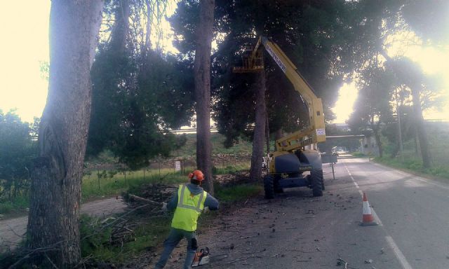 El servicio de Parques y Jardines de la Concejalía de Urbanismo e Infraestructuras del Ayuntamiento de Cartagena está llevando a cabo, durante esta semana y parte de la próxima, tareas de poda, recorte y tala de árboles en la antigua nacional 301, entre Los Dolores y El Albujón. Se trata de ejemplares que presentan ramas secas con peligro de caída sobre la calzada o incluso que se han secado en su totalidad.Los trabajos han sido contratados por unos 20 mil euros a una empresa especializada en conservación de arboricultura. En esta antigua carretera nacional existen unos 700 árboles, de los que 145 presentan problemas. En estos son en los que se están interviniendo. Se trata de 100 pinos, 44 eucaliptos y una morera, a los que se les está realizando una poda de seguridad en altura, incluyendo la tala de 10 árboles secos. Durante los trabajos no está previsto que se corte el tráfico en su totalidad, ya que se está utilizando uno de los dos carriles existentes, para ir dando paso alternativo a la circulación.