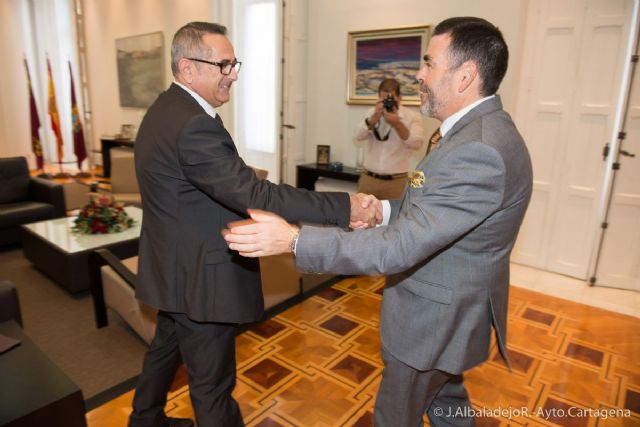 El alcalde de Cartagena, José López, ha recibido esta mañana, en el Palacio Consistorial, a su homólogo del Ayuntamiento de La Unión, Pedro López. Durante el encuentro, los regidores han tratado cuestiones de interés para ambos municipios, reafirmando los lazos de colaboración entre las instituciones que presiden.
