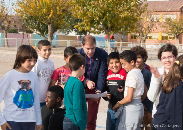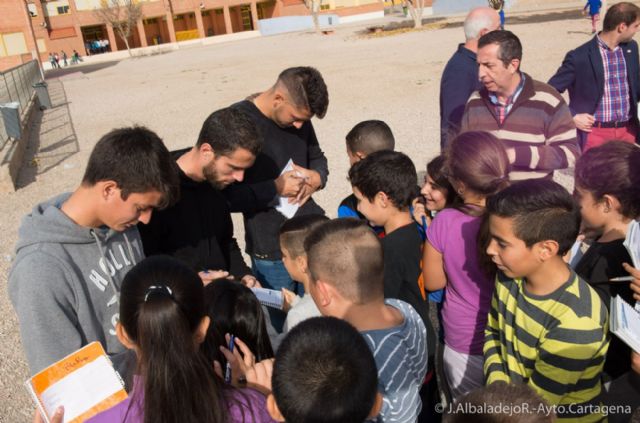 Allí han mantenido un encuentro con los escolares y, con la ayuda del concejal de Deportes, Ricardo Segado, que también ha asistido a esta cita, les han regalado 300 entradas para asistir este domingo a las 12 del mediodía al Estadio Municipal Cartagonova, para disfrutar del encuentro que enfrentará al Cartagena con el Melilla.