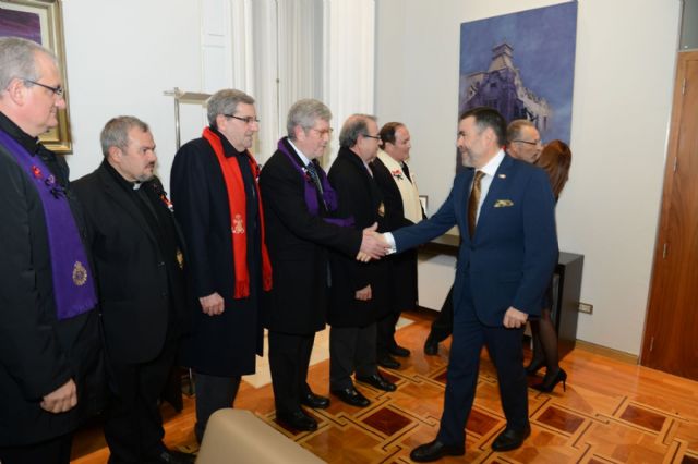 Previamente se habían reunido los cabildos generales de las cuatro cofradías: la marraja, california, resucitados y los del Socorro. Tras el encuentro, se han dirigido a ritmo de marcha al Palacio Consistorial para ser recibidos por el alcalde, la vicealcaldesa, Ana Belén Castejón, y el resto de la corporación municipal.