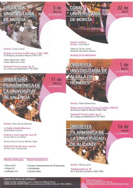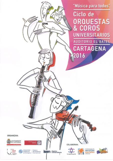 El auditorio municipal del Batel acogerá un conjunto de conciertos en los próximos meses que acercará a todos los públicos a la música clásica. Cuatro orquestas y una coral serán las encargadas de ofrecer un ciclo pionero en la ciudad con el que inicia su trabajo la recien creada red Sinergia de Orquestas Universitarias Españolas. La orquestas procedentes de Murcia, Valencia, Alicante y Alcalá de Henares, a las que se suma la Coral Universitaria de Murcia en un programa organizado por la Concejalía de Cultura, Educación e Igualdad, las dos universidades públicas de la región, y el ISEN, y que cuenta con la colaboración de las concejalías de Igualdad y Servicios Sociales y la Federación de Asociaciones de Vecinos de Cartagena y comarca.El Ciclo de Orquestas&Coros Universitarios ha sido presentado esta mañana por el concejal de Cultura, David Martínez, que ha contado con la asistencia de representantes del ámbito universitario como el director del Instituto Superior de Enseñanza (ISEN), Luis Cruz, el vicerrector de la Universidad Politécnica de Cartagena (UPCT), Francisco Martínez, y la coordinadora de Cultura de la Universidad de Murcia (UMU), Diana Marta de Paco. Además, también ha estado presente el director de la coral y la orquesta de la UMU, Jorge Losana, y la presidenta de la Federación de Asociaciones de Vecinos de Cartagena, Cristina Roca.La primera cita con este ciclo de conciertos será el 3 de marzo a las 20:00 horas de la mano de la Orquesta Universitaria de Murcia, seguida de la Orquesta Filharmónica de la Univesitat de Valencia el 11 de Marzo, La orquesta Universitaria de Alcalá de Henares el 1 de mayo y la Orquesta Filharmónica de la Universidad de Alicante el 16 de Junio. Además, el próximo 22 de abril la Coral Universitaria de Murcia ofrecerá un espectáculo diferente basado en los musicales de Broadway.La meta del conjunto de conciertos es facilitar el acceso a la cultura y, en este caso, a la música, a todos los ciudadanos, ya que, tal y como ha afirmado David Martínez, la música une y alimenta nuestras almas. Desde los diferentes colectivos han querido hacer una llamada también a todos aquellos que nunca han disfrutado de un espectáculo en directo en un teatro para que puedan permitírselo a través de módicos precios. La organización del ciclo va a hacer un especial esfuerzo para facilitar que miles de personas que no constituyen el público habitual de estos ciclos tengan la oportunidad de asistir a ellos. Para ello se está trabajando con las redes asociativas del municipio y se ha establecido una política de precios que eviten barreras económicas. Así, los precios de las entradas generales son de 4 euros en anfiteatro y 6 platea, ofreciendo bonos de 20 euros para todas las actuaciones. Además se ofrece precio reducido para grupos y asociaciones de 15 personas, estudiantes, poseedores del Carnet Joven y jubilados de tan sólo 3 euros por concierto.Las entradas se pueden adquirir desde hoy mismo en las taquillas del auditorio de lunes a sábado de 10:00 a 21:00 horas, en las taquillas del Teatro Circo de lunes a viernes de 10:00 a 14:00 y de 17:00 a 20:00 horas. También se puede realizar la compra a través de Ticketmaster o al número de teléfono 902150025.