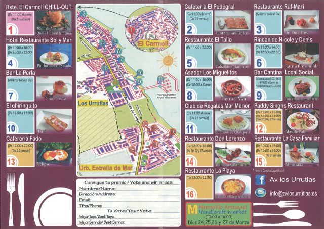 Además, la edil, acompañada por el presidente de la asociación de vecinos de Los Urrutias, Severo Sánchez, ha destacado el carácter sugerente y simpático del cartel de la ruta que, según Gómez, coincide esta alegría con el inicio de la retirada de los espigones en la localidad. Para finalizar, Obdulia ha animado a los habitantes de Los Urrutias, así como a los turistas a que participen en la ruta, que esperemos que sea un éxito y se vendan mas tapas que el año anterior.