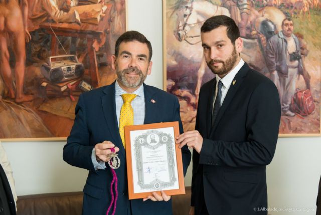 El alcalde de Cartagena, José López, ha recibido esta mañana la medalla de Hermano Cofrade de San Ginés de la Jarade la mano del Hermano Mayor de la cofradía, Víctor Javier Navarro, el secretario de la cofradía, José Miguel Chocano, y el capellán, Lázaro Gomarzi.