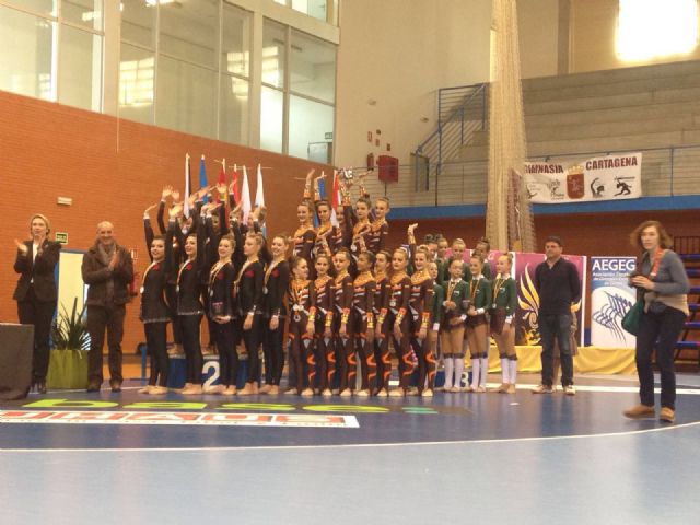 Junto a estos compitieron los equipos infantiles del Club Estética Cartagena, que se estrenaron en la competición nacional. El equipo Senior del Club Rítmica Cartagena se impuso en la final con un espectacular ejercicio que añadió una nueva medalla de oro a su ranking nacional.