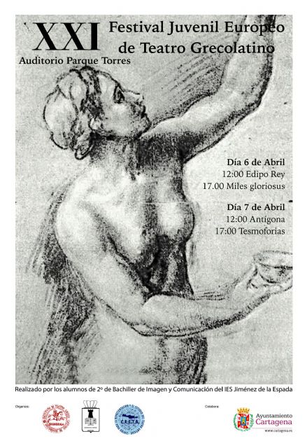 Con el escenario incomparable del mar como telón de fondo, los personajes clásicos de las obras de Sófocles, Plauto y Aristófanes cobrarán vida, un año más, en la XXI edición del Festival Juvenil Europeode Teatro Grecolatino que se celebrará durante los días 6 y 7 de abril en el auditorio de Parque Torres. Más de 20 años en el que el proyecto; que nació fruto de la ilusión y del trabajo del ya fallecido y que fuera director del Instituto de Educación Secundaria, Ricardo Alarcón; sigue adelante gracias al empeño de los educadores y del reciente apoyo del Ayuntamiento de Cartagena.