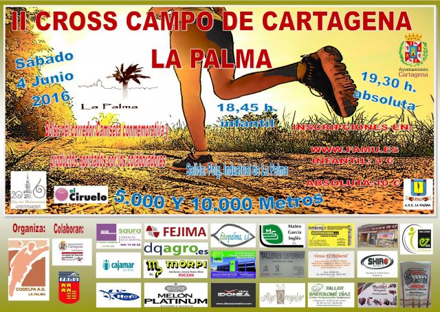 Los aficionados al deporte y a las carreras tendrán un cita el próximo sábado, 4 de junio, en la segunda edición del Cross de La Palma. Esta prueba deportiva constará de dos pruebas de 5 y 10 kilómetros para categorías absolutas y de 300 metros, 600 metros y 1.500 metros para categorías pre-benjamín, benjamín y alevines e infantiles. Las carreras darán comienzo por la tarde a las 18:45 horas las pruebas de niños y a las 19:30 horas las de adultos.