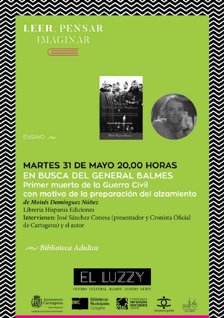 La Biblioteca del Luzzy acogerá este martes 31 de mayo la presentación de la obra de Moisés Domínguez En busca del general Balmes. Primer muerto de la Guerra Civil con motivo de la presentación del alzanmiento, en un acto que tendrá lugar a las 20,00 horas y donde el autor estará acompañado por el Cronista Oficial de Cartagena, José Sánchez Conesa.