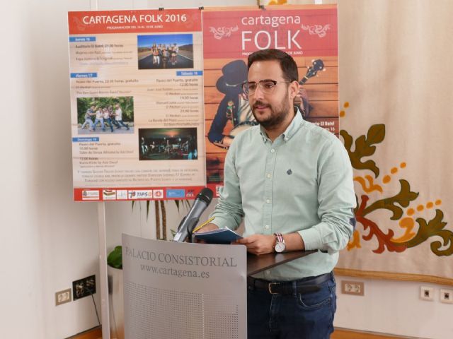 Cartagena Folk, organizado por la Concejalía de Cultura del Ayuntamiento de Cartagena, ha sido presentado esta mañana por el concejal de Cultura, David Martínez, y el promotor musical Toni Peña, que ha contado también con las actuaciones en directo de La Banda de Don Pepo yJuan José Robles, parte del cartel del festival.