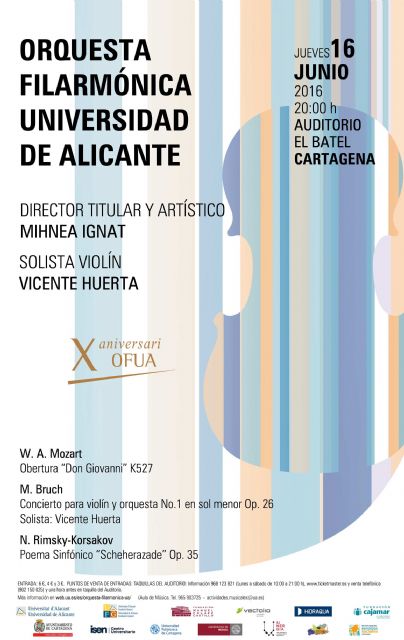 Con motivo de la clausura del Ciclo de Orquestas y Coros Universitarios Cartagena 2016, el jueves día 16 de junioactuará en el Auditorio y Palacio de Congresos El Batel laOrquesta Filarmónica de la Universidad de Alicante(OFUA) a partir de las 20.00 horas.