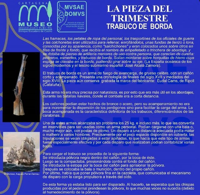 La Asociación de Amigos del Museo Arqueológico Municipal de Cartagena (MUSAEDOMUS) tiene programada para este mes la presentación de la Pieza del Trimestre, que se expondrá en el centro museístico en un lugar preferente y que en este caso corresponde al Trabuco de Borda.