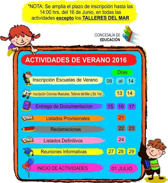 La Concejalía de Educación del Ayuntamiento de Cartagena ha publicado hoy viernes la lista de admitidos en las Escuelas de Verano, con y sin comedor, que vienen a añadirse a las ya publicadas con anterioridad las Colonias Musicales, Educación Vial y Talleres del Mar, programados para estas vacaciones estivales.