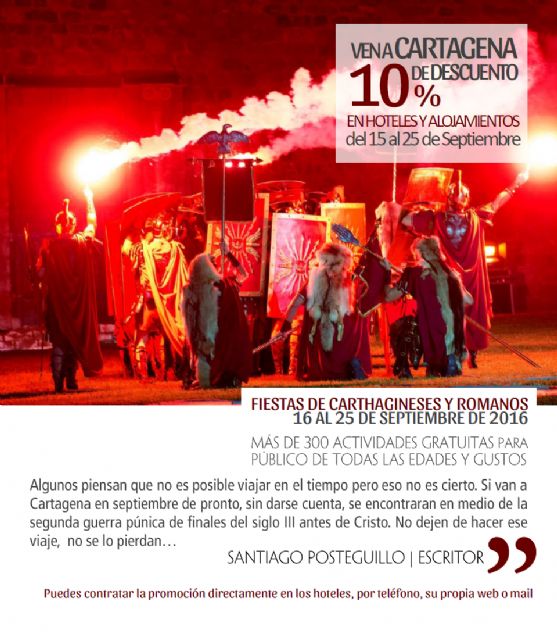 Para la próxima edición de Fiestas, la Agrupación de Hoteles y Alojamientos Turísticos de Cartagena (Agrup-Hotel) pondrá en marcha una nueva estrategia para aumentar la demanda de plazas hoteleras en la ciudad ofreciendo a los turistas que quieran visitar la ciudad para conocer Carthagineses y Romanos “un descuento del 10% de manera inmediata sobre las tarifas existentes en las páginas webs corporativas de todos los hoteles y alojamientos asociados en la agrupación hotelera», indicó su presidente, Juan Carlos García. Este descuento se ofrecerá desde el 15 hasta el 25 de septiembre a todos aquellos que lo soliciten al efectuarsu reserva directa al hotel o al alojamiento asociado, por teléfono, su web corporativa o su correo electrónico.