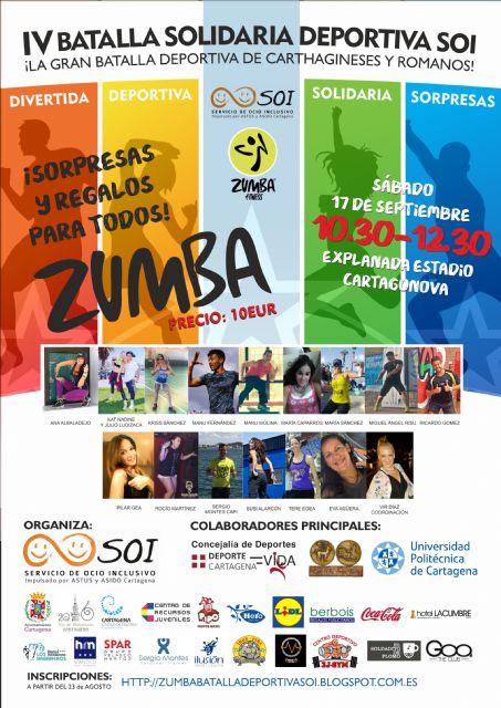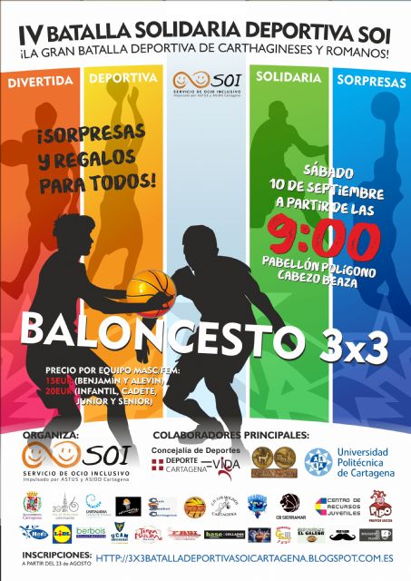 Un año más, deporte y solidaridad se darán cita en la  IV Batalla Solidaria Deportiva de las Fiestas de Carthagineses y Romanos. El evento contará con dos actividades, un torneo de baloncesto 3x3 y una clase de zumba, y su recaudación estará destinada a que los cartageneros con discapacidad intelectual también disfruten de su ocio y tiempo libre.