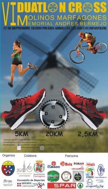 La sexta edición del Duatlón Cross de Molinos Marfagones recorrerá los parajes naturales de la zona oeste de la comarca de Cartagena el próximo sábado, 17 de septiembre. Esta prueba deportiva, única en la comarca de Cartagena en su modalidad, consiste en correr durante 5 kilómetros, luego coger la bicicleta de montaña durante 20 kilómetros y, por último, volver a correr unos 2,5 kilómetros. La competición, está organizada por el club deportivo La Soledad en colaboración con la Concejalía de Deportes del Ayuntamiento de Cartagena y de la Federación de Triatlón de la Región de Murcia.