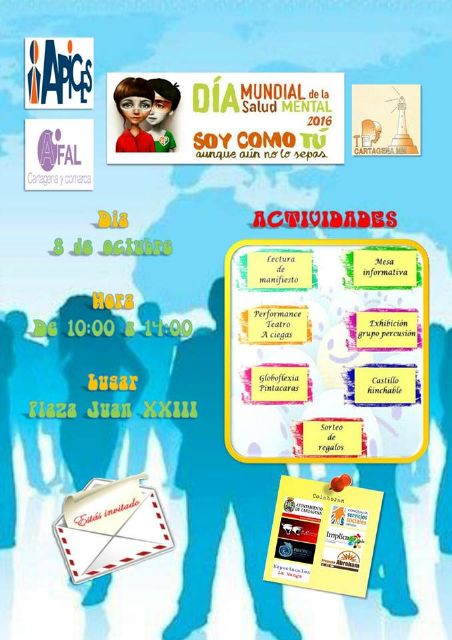 La Plaza Juan XXIII de Cartagena será el escenario en el que este sábado, 8 de octubre, las asociaciones Apices, Afal y de Ayuda e Investigación de los Trastornos de la Personalidad (TP) invitarán a romper barreras y descubrir un mundo conjunto donde todas las personas son iguales.