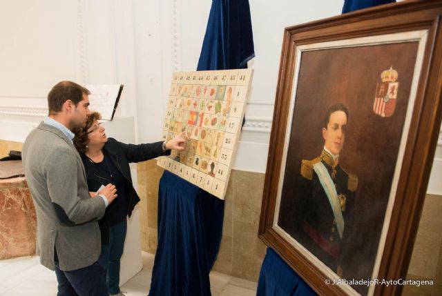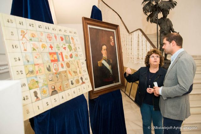 El Palacio de Molina ha acogido hoy, 26 de octubre, la presentación de dos piezas, un retrato del rey Alfonso XII y un juego de mesa, que se podrán visitar durante tres meses en estas instalaciones. Las obras han recuperado su esplendor gracias al Taller de Restauración municipal y tienen la peculiaridad que durante el proceso de restauración del retrato institucional del rey se retiró el antiguo reentelado que resultó ser un juego de mesa con referencias a la ciudad de Cartagena que había permanecido oculto durante décadas. Sendas obras datan del siglo XIX y son de autor desconocido.