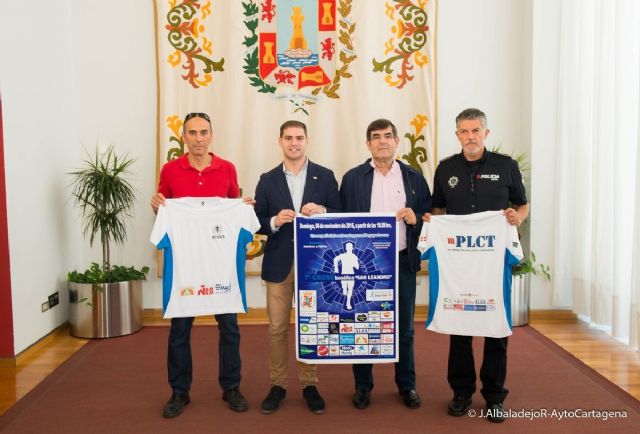El concejal del Área de Interior y Seguridad Ciudadana, Francisco Aznar; el concejal de Deportes, Ricardo Segado; y el cabo de la Policía Local y coordinador de la prueba, José Antonio Quijada, han presentado hoy en la Sala de Prensa del Palacio Consistorial esta cita del calendario running de Cartagena; una carrera benéfica que tendrá lugar el domingo 6 de noviembre a partir de las 10,30 horas y que celebra el patrón de la Policía Local, a la que Ricardo Segado ha agradecido la enorme y callada labor que presta a la Concejalía de Deportes en sus más de 20 carreras populares.