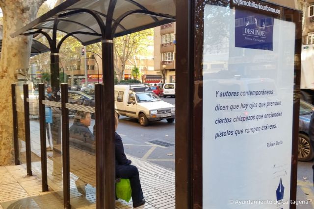 En las aceras, calles, paradas de autobuses o plazas, los transeúntes de Cartagena podrán disfrutar de los poemas de diferentes autores gracias a la publicidad del festival poético Deslinde