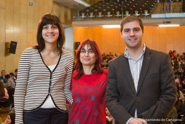 La escritora Mónica Rodríguez ha charlado en la mañana de hoy martes con una parte del jurado del premio Hache, 600 estudiantes de distintos centros educativos de Cartagena, en el Paraninfo de la UPCT. Se trata del primer encuentro con autores de esta IX edición del galardón literario, que deciden adolescentes de entre 12 y 14 años de la ciudad. La autora se presenta a este premio con la obra El naranjo que se murió de tristeza (Edelvives, 2013).