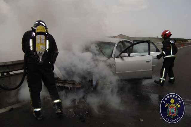 Bomberos del Servicio de Extinción de Incendios y Salvamento del Ayuntamiento de Cartagena sofocaban este mediodía el incendio registrado en un turismo cuando circulaba por la vía rápida de La Manga, a la altura de El Algar.