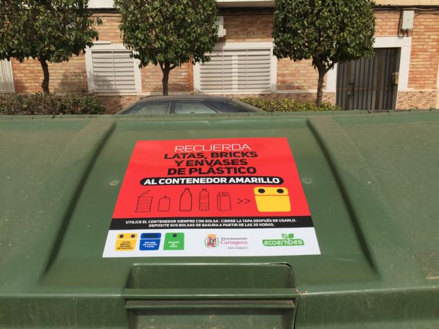 El Ayuntamiento de Cartagena está colocando 150 pegatinas informativas de vinilo en distintos contenedores verdes que se encuentran junto a contenedores de reciclado. El mensaje que contienen pretende recordar a los ciudadanos que el contenedor verde se utiliza para materia orgánica y restos, mientras que todos los plásticos, latas y bricks deben ir al contenedor amarillo.