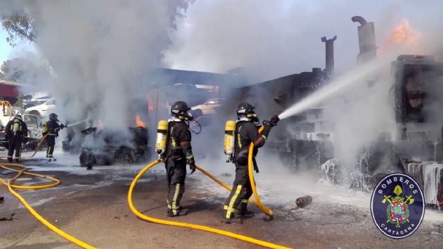Bomberos de Cartagena emplean cuatro horas en extinguir un incendio en un desguace de la carretera de Cuesta Blanca