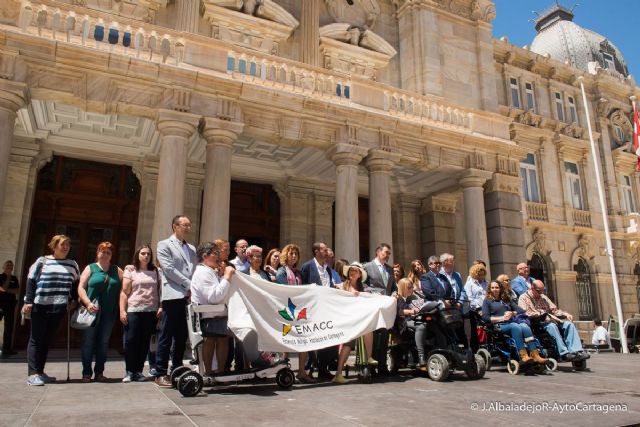 Hoy lunes, 15 de mayo, se celebra el vigésimo aniversario de la constitución de la Asociación de Esclerosis Múltiple de Cartagena y su Comarca (EMACC) y con motivo de ello, el Ayuntamiento de Cartagena ha organizado una serie de actos junto a la asociación que han incluido la lectura de un manifiesto frente al Palacio Consistorial, en el que se ha pedido la puesta en marcha de un Centro de Día para los pacientes de esta enfermedad. En el acto han participado el alcalde de Cartagena, José López, y la concejal de Servicios Sociales, Carmen Martín.