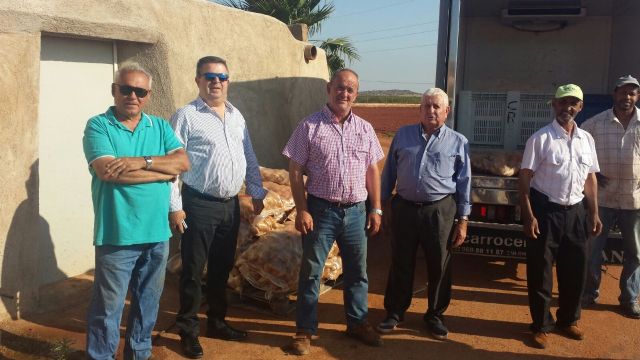 El portavoz del Grupo municipal MC y concejal del área de Calidad de Vida, Francisco Calderón, junto a voluntarios del Banco de Alimentos de la Región, se han citado esta mañana con una representación de agricultores del Campo de Cartagena para hacer efectiva la recepción de la donación de media tonelada de patata recién recolectada que tendrá como destino los beneficiarios del Banco de Alimentos regional, situado en Cartagena.