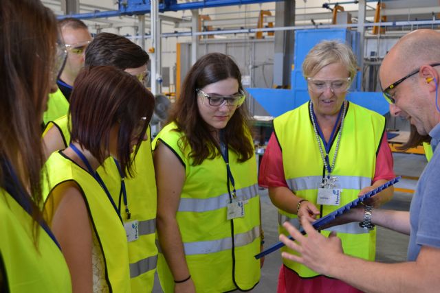 La visita ha incluido un recorrido por las instalaciones de la fábrica y charlas con el director general, con los responsables de Recursos Humanos y Marketing, así como con las tres ingenieras y exalumnas de la UPCT empleadas en la compañía. “Ya en la carrera éramos muy poquitas, pero teníamos muy buen trato de los profesores y la experiencia en la Politécnica fue muy buena”, recuerda una de ellas, Cristina Gómez, que achaca a cánones sociales y a la mayor predilección de los hombres por tareas análiticas el desequilibrio entre géneros en la profesión.