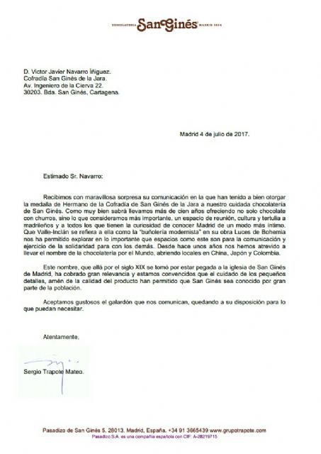 La Cofradía de San Ginés de la Jara (Patrón de Cartagena), ha visitado esta mañana la Chocolatería de San Ginés de Madrid, para hacer entrega de la medalla de Hermano y un capacico de frutos del Campo de Cartagena, en reconocimiento por la excelente labor profesional llevada a cabo diariamente, bajo el nombre de San Ginés desde el año 1894.