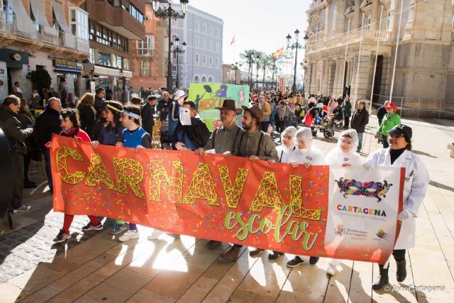 Cientos de niños han llenado de color con sus disfraces las calles del centro de Cartagena, la mañana del viernes 9 de febrero. El Pasacalles Escolar comenzaba a las 11 horas, iniciándose el recorrido en la Plaza del Ayuntamiento y finalizando en la Plaza de Juan XXIII.