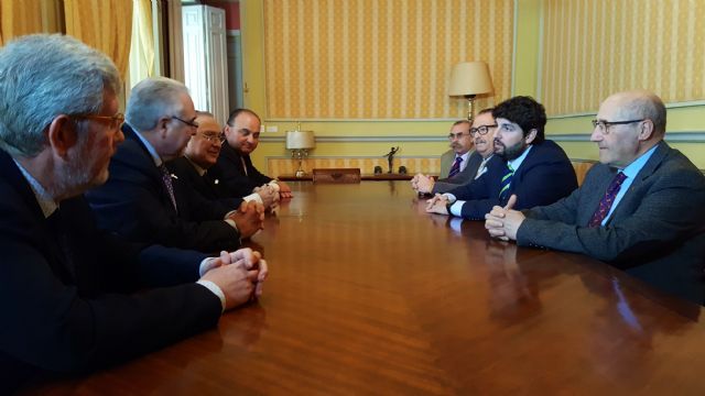 El jefe del Ejecutivo regional, Fernando López Miras, recibió hoy el nombramiento de 'Procesionista de Honor', que otorga la Asociación Procesionista del Año de Cartagena, durante un acto que tuvo lugar hoy en el Palacio de Aguirre, y donde el presidente de esta asociación, Santiago Díaz, le hizo entrega de un cuadro con dicho nombramiento.