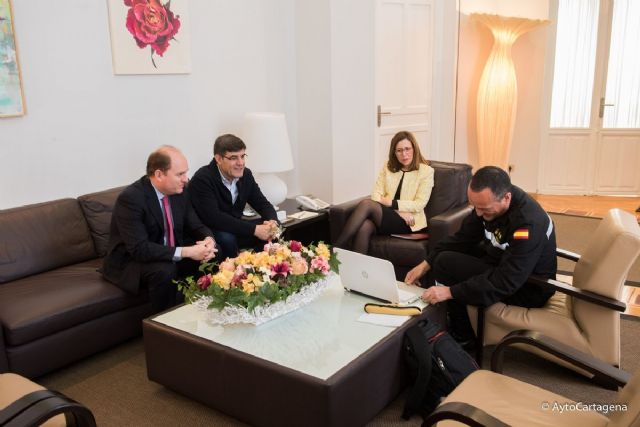 La alcaldesa de Cartagena, Ana Belén Castejón, ha recibido hoy viernes en el Palacio Consistorial al director general de Seguridad Ciudadana y Emergencias, José Ramón Carrasco, y al teniente coronel jefe del III Batallón de la UME, Javier Moreno, en una reunión en la que también ha estado presente el edil de Seguridad Ciudadana, Francisco Aznar.