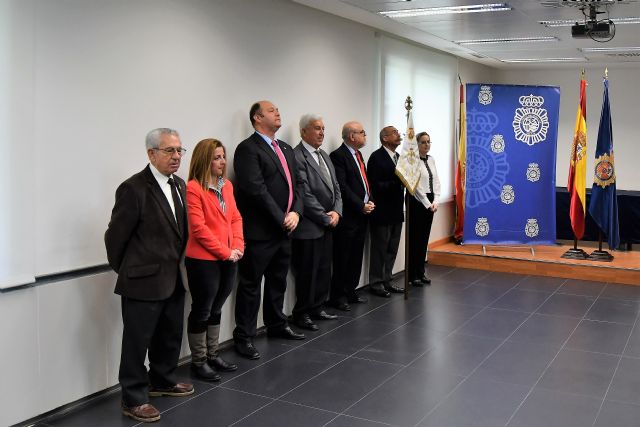 La Agrupación Nuestro Padre Jesús Resucitado, de la Cofradía del mismo nombre, ha hecho entrega esta mañana de un banderín o gallardete al Cuerpo Nacional de Policía (CNP) en un acto al que ha acudido el Delegado de Gobierno en Murcia, Francisco Bernabé, así como el Comisario, Ignacio del Olmo, y la presidenta de la Agrupación del Resucitado, Marién García Boj.