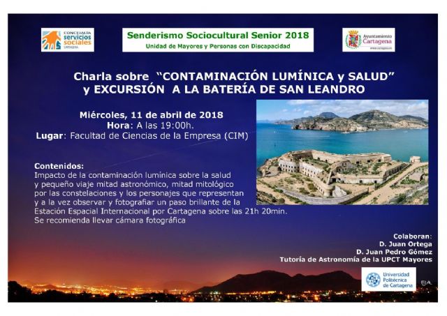 Los profesores de astronomía de la UPCT, Juan Ortega y Pedro Gómez, junto a tres alumnos de su tutoría, ofrecieron al grupo de Senderismo Senior de la Concejalía de Servicios Sociales una charla sobre sobre 'El impacto de la contaminación lumínica sobre la salud'. La actividad se llevó a cabo este miércoles 11 de abril en la Facultad de Ciencias de la empresa CIM.