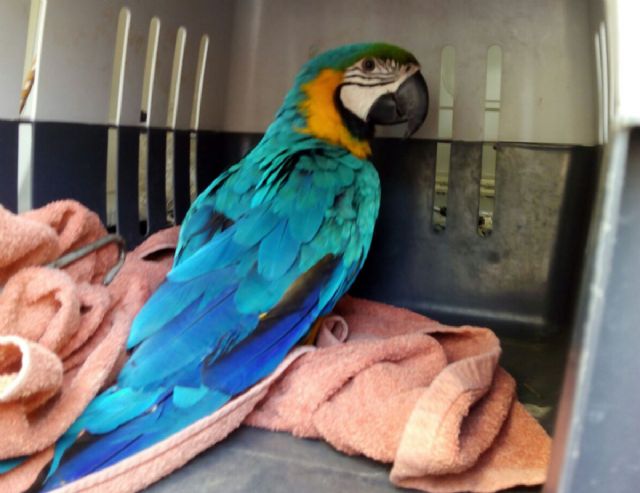 Agentes de la Policía Local de Cartagena destinados a la Unidad de Barrios, han intervenido en la mañana de hoy martes en la calle Ramón y Cajal, en el rescate de un loro que se encontraba debajo de un vehículo.