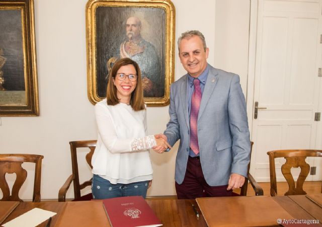 A la firma del convenio ha acudido la alcaldesa de Cartagena, Ana Belén Castejón; y el presidente de Cartagena Fútbol Sala Plásticos Romero, Roberto Sánchez.