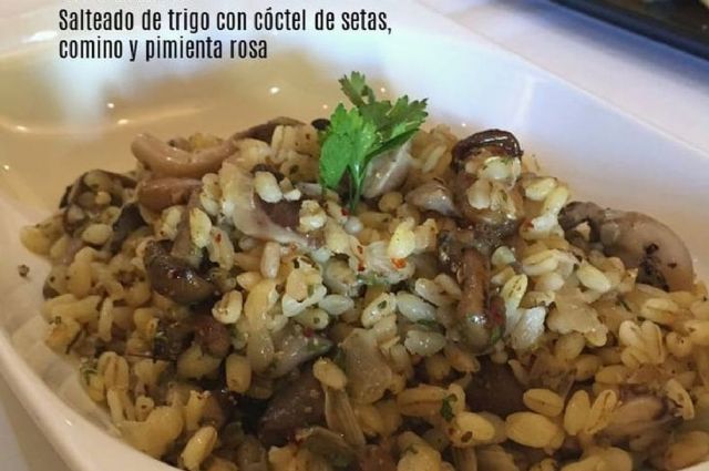 Salteado de trigo con cocktail de setas salteadas, comino y pimienta rosa
