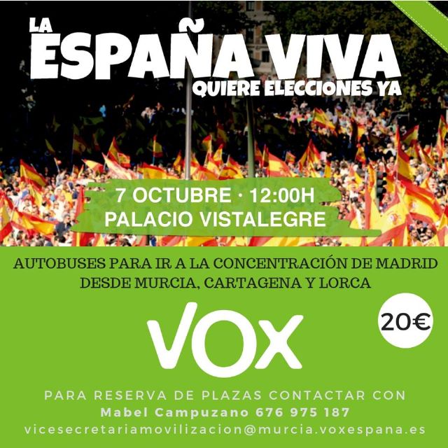 Se podrá reservar plaza en los autobuses que partirán de Cartagena, Lorca y Murcia para que afiliados y simpatizantes puedan asistir a este importante acto de la España viva. También informaremos acerca de nuestras actividades, próximos eventos y propuestas políticas.