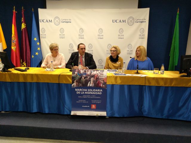 El director académico del Campus de la UCAM en Cartagena, Juan Alfonso García; la concejal de Servicios Sociales del Ayuntamiento de Cartagena, Mercedes García; la presidenta de la Asociación de Vecinos de la Barriada Hispanoamérica, Andrea María Rebuffo, y la representante de Caritas Cartagena, , han presentado esta mañana la II Marcha Solidaria de la Hispanidad, que se celebrará este sábado, 13 de octubre, a partir de las 17:30 horas, desde la Plaza María Auxiliadora, punto en el que también concluirá el itinerario.