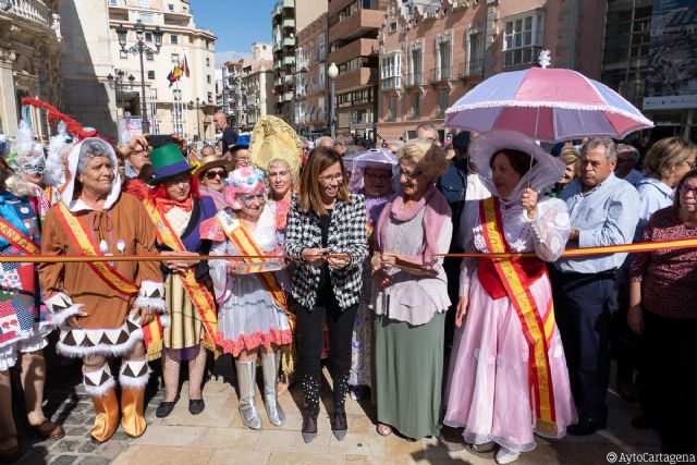 La alcaldesa de Cartagena, Ana Belén Castejón; la concejala de Servicios Sociales, Mercedes García; el concejal de Infraestructuras, Juan Pedro Torralba; y la presidenta de la Federación de los Club de Mayores, María Beteta; junto a una representación de mayores de los clubes, que han asistido a la inauguración de la feria vestidos trajes de carnaval.