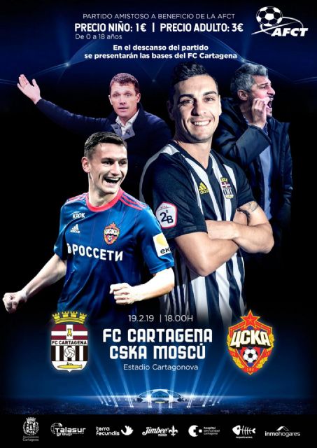 Hoy ha tenido lugar la presentación del partido amistoso que disputará el FC Cartagena contra el CSK de Moscú a beneficio de la AFCT y que se disputará el próximo 19 de febrero a las 18 horas. La presentación que ha tenido lugar en el estadio Cartagonova, la han realizado el Director Deportivo del FC Cartagena Manolo sanchez Breis el presidente de la Fundacion FC Cartagena Isidoro García un represéntate del equipo ruso y y Luis Buendia Secretario y Vicepresidente de la AFCT