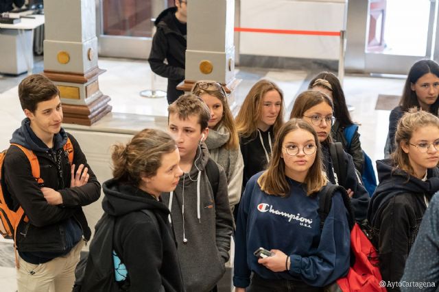 26 alumnos franceses que se encuentran temporalmente de intercambio en el Colegio La Inmaculada Franciscanos, acompañados de profesores de su centro francés y del colegio cartagenero, han visitado esta mañana, 6 de marzo, a las 10 horas, el Palacio Consistorial.
