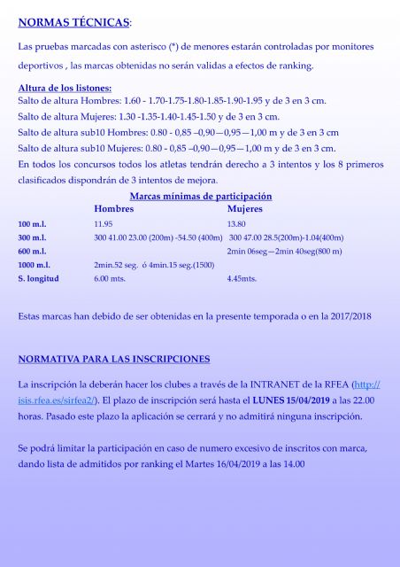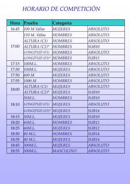 12 Pruebas absolutas y 10 de menores llenarán la tarde del 17 de Abril de atletismo en estado puro en la desgastada pero siempre perenne Pista de Atletismo del Ensanche de la ciudad portuaria donde las pruebas de lanzamientos no se podrán realizar al estar la pradera de la pista en obras que no permiten un correcto desarrollo de estas pruebas.