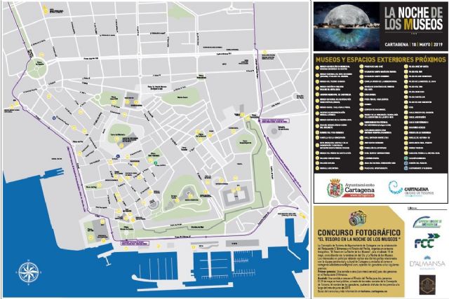 A su vez, la Concejalía de Turismo del Ayuntamiento de Cartagena en colaboración con Lhicarsa y Fcc pone a disposición de los ciudadanos un rutero con un plano de situación de los diferentes espacios donde se desarrollan las actividades del este evento cultural de la Noche de los Museos y que se facilitarán desde los diferentes espacios museísticos así como desde las Oficinas de Turismo.
