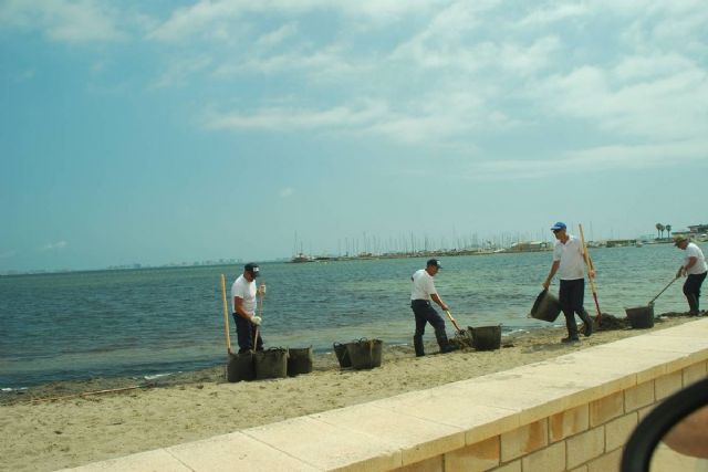 Para hacer frente a ello y de cara al fin de semana, el personal del Ayuntamiento se ha intensificado su colaboración con la empresa TRAGSA contratada por la Comunidad Autónoma de la Región de Murcia para realizar estas tareas, a la vez que el personal contratado por el consistorio a través del Servicio de Empleo y Formación (SEF) harán lo propio en el entorno de las playas de Los Nietos.