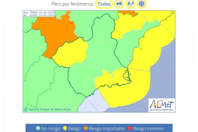 La Agencia Estatal de Meteorología (AEMET)  ha actualizado sus avisos por fenómenos meteorológicos adversos para hoy martes, 21 de enero, manteniendo hasta las 12 del mediodía el nivel amarillo por lluvias de hasta 60 litros por metro cuadrado en el Campo de Cartagena y temporal del nordeste con mar de fondo con olas de hasta tres metros de altura en la costa..