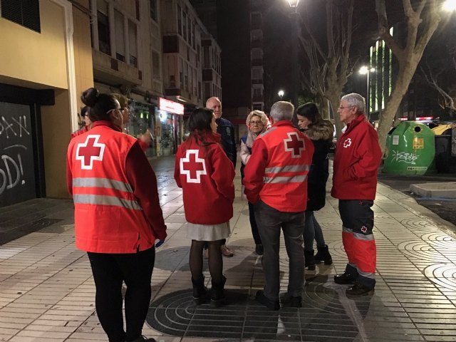 Un equipo de la concejalía de Servicios Sociales del Ayuntamiento acompañó en la noche de ayer a los voluntarios de las Unidad de Emergencia Social (UES) de Cruz Roja Española en Cartagena, que salen a atender a las personas sin hogar todos los días del año dos veces por semana. En esta ocasión, se unieron al trabajo de los voluntarios la concejala del área, Mercedes García, el responsable del servicio de atención a las personas sin hogar, José Antonio Martínez Meca y la educadora social Gema Belchí.